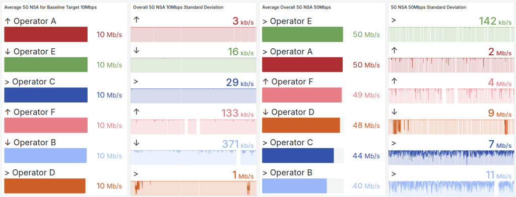 Monthly comparative scorecards compare 6 UK operators at 10Mbps and 50Mbps for 5G NSA test cases